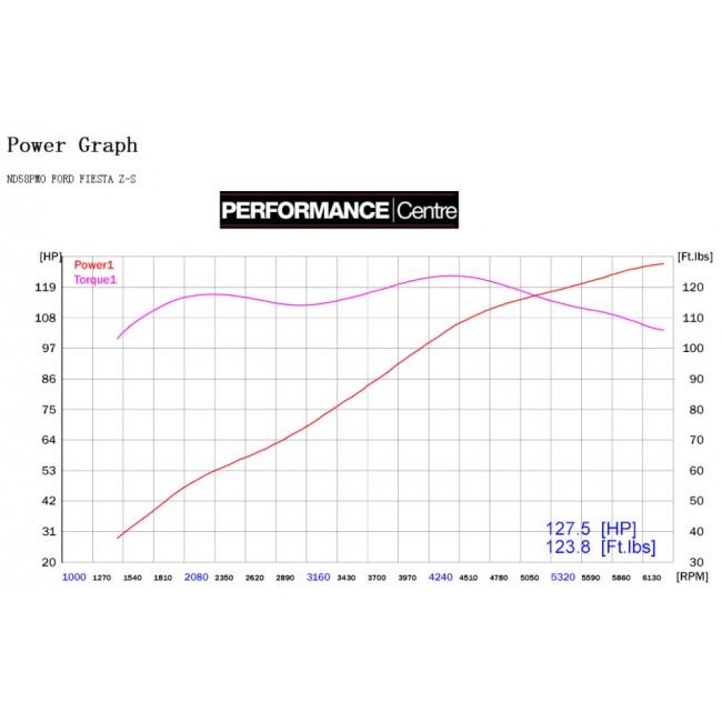 Independant power testing of the 1.6 litre Zetec S (with flex type exhaust) fitted along with an upgraded manifold and air filter revealed a +9bhp increase in power and a +11 ft-lb increase in torque taking the car to 127bhp and 123 lb-ft of torque before the re-map was applied.