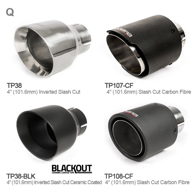 This exhaust has a choice of 4" (101.6mm) tailpipe options including a choice of carbon fibre tip options.